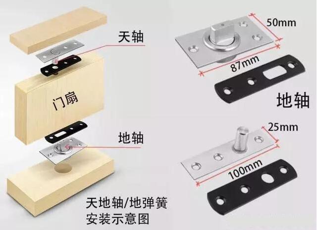 旋轉門和旋轉隔斷的是通過地彈簧和天地軸來實現旋轉的,我們先來簡要的看看它們的通用構造做法: