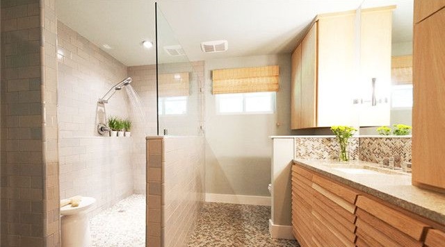 為了提高衛生間的使用率,通常會在衛生間做干濕分離設計。由于空間面積不夠大同時也為了省錢,一些人會采用浴簾+擋水條方式將干區和濕區分開,然而由于材質問題,浴簾的遮擋效果不是很理想。因此大多數人采用磨砂玻璃材質的活動隔斷墻,這樣不僅起著隔開空間的作用,同時還不會影響光線,整個空間顯得更加通透。如果不需要隔斷就可以將它收攏,又會還你一個敞亮的衛生間。
